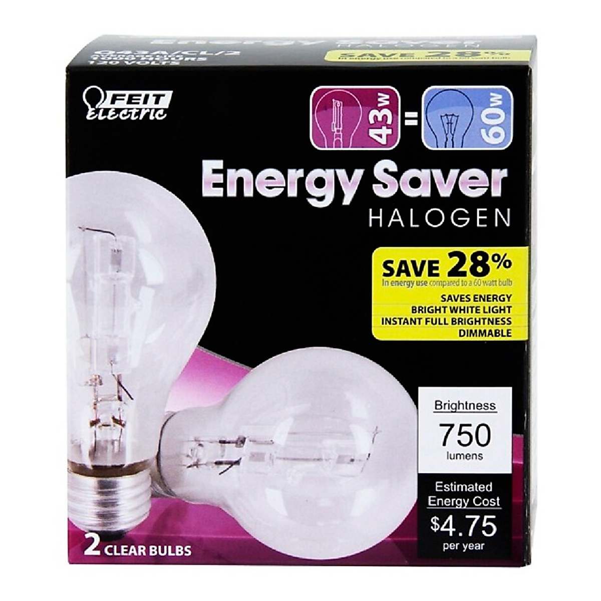 PAQ. 2 BOMBILLOS HALOGENO CLAROS A19, 60W USA 43W, DIMEABLE BRIGHT WHITE,3000K, 750LUMENS, FEIT ELEC