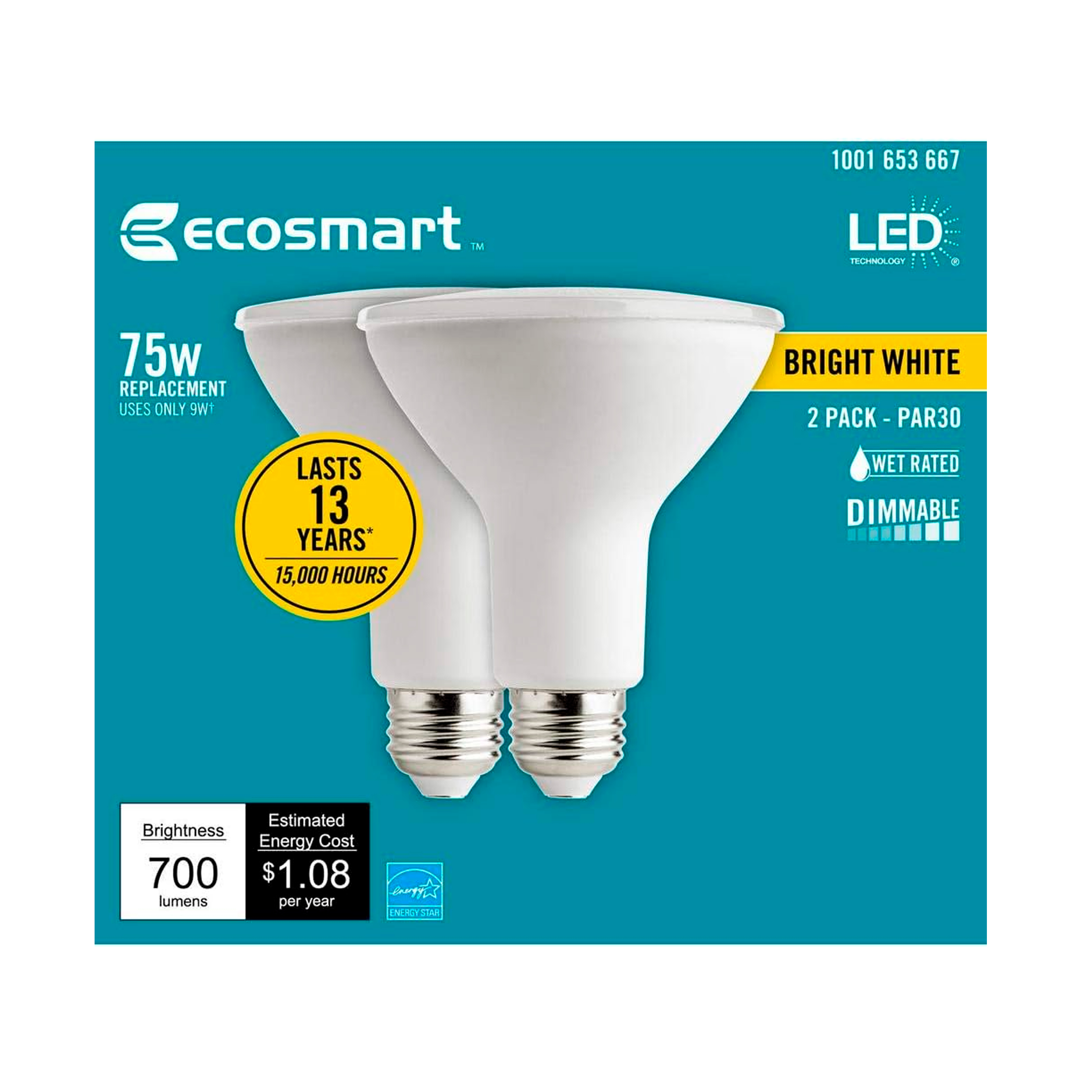 PAQ. DE 2 REFLECTOR PAR20 LED REGULABLE BRIGHT WHITE, E26,50W, 3000K, 500LUMENS, ECOSMART
