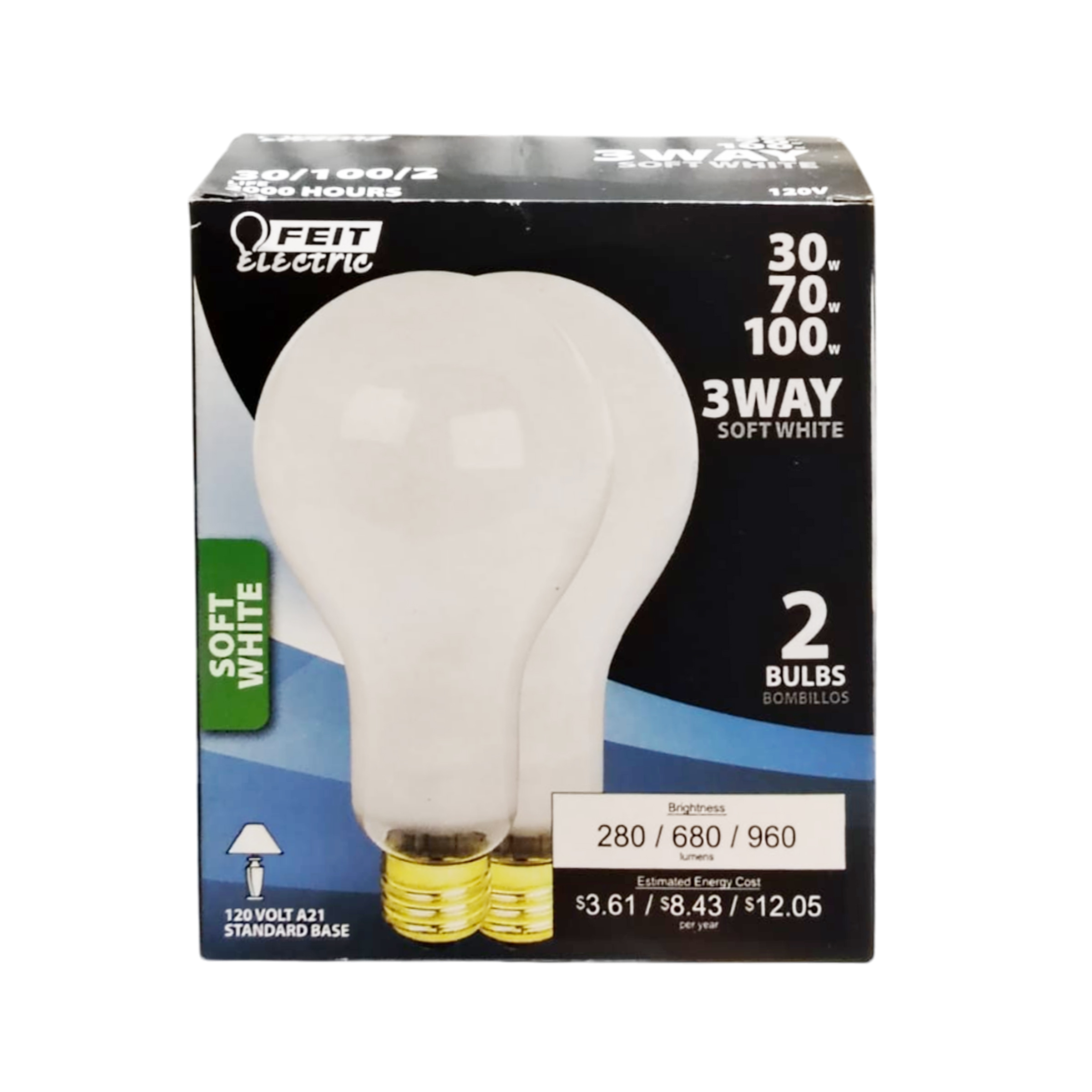 PAQ. 2BOMBILLOS 3 VIAS INCANDECENTE 2700K, 30W,70W,100W, SOFT WHITE, 120V, 280,680,960LUMS, A21, FEI