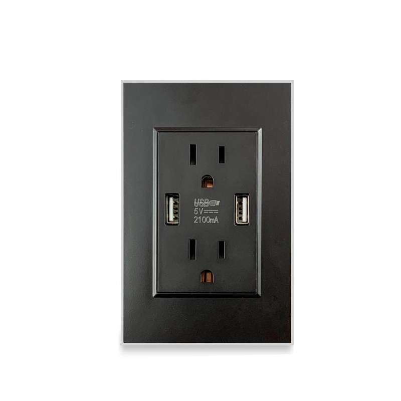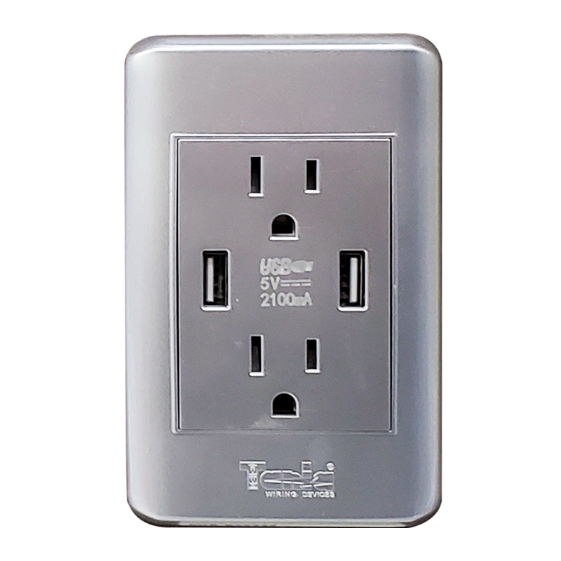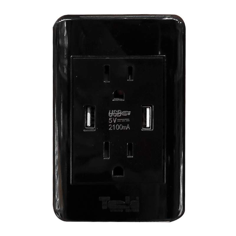 TOMA DOBLE CON TIERRA 2 USB 15AMP-125V NEGRO-PLATA CROMADO