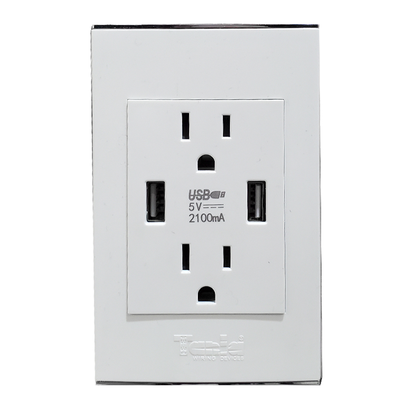 TOMA DOBLE POLARIZADO + TOMA DOBLE USB 2.1 AMP (BLANCO BORDE CROMADO-DELUX)