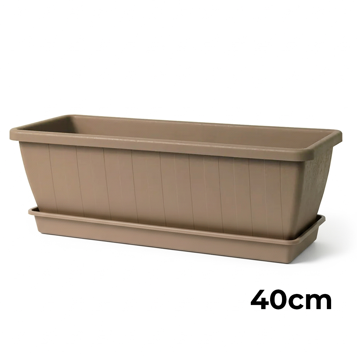 MACETERA KEZAR 40CM TAUPE RECTANGULAR CON BANDEJA INCORPORADA