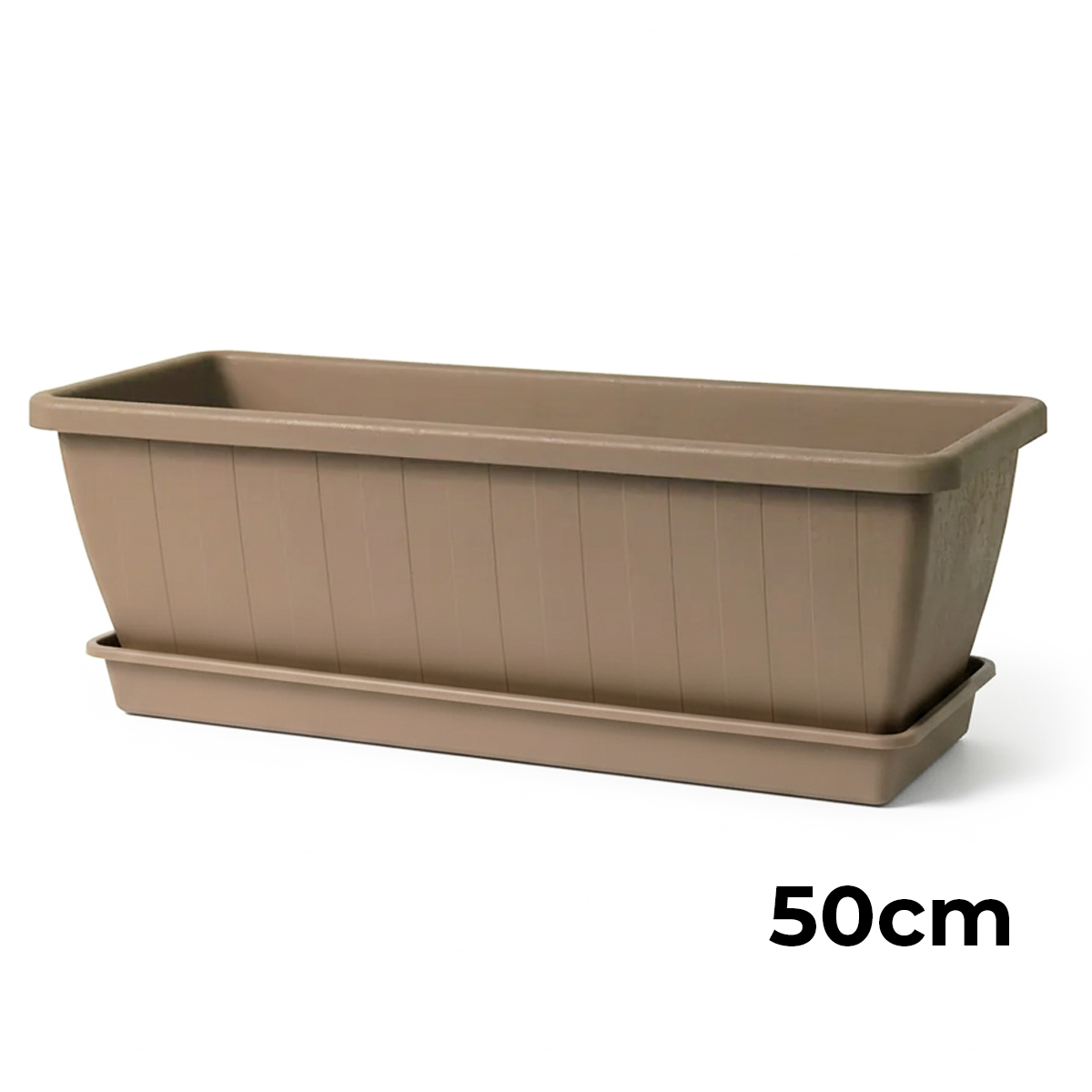 MACETERA KEZAR 50CM TAUPE RECTANGULAR CON BANDEJA INCORPORADA