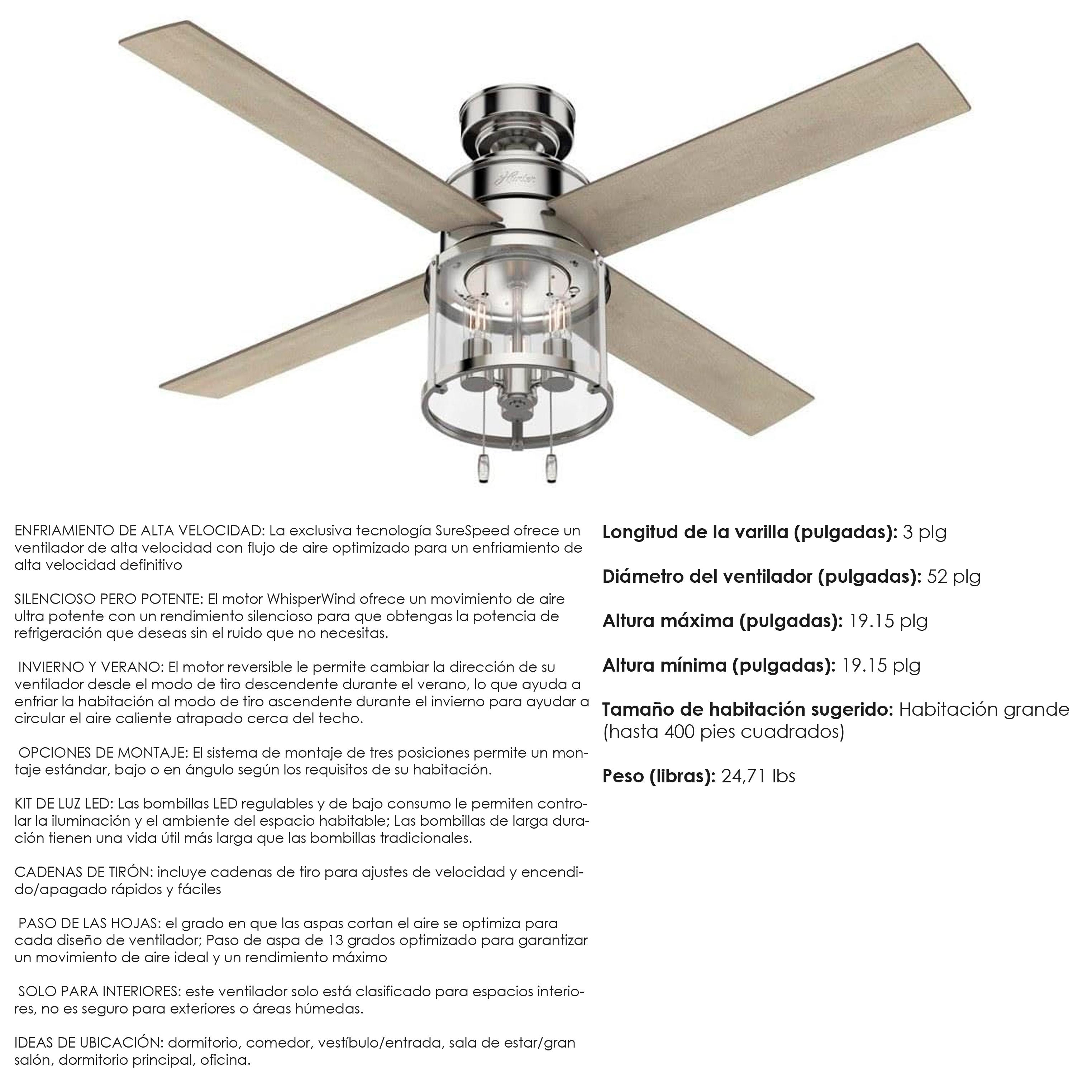 VENTILADOR DE TECHO ASTWOOD 52" CON LAMPARA NIQUEL CEPILLADO 4 ASPAS PINO GRIS PARA INTERIOR