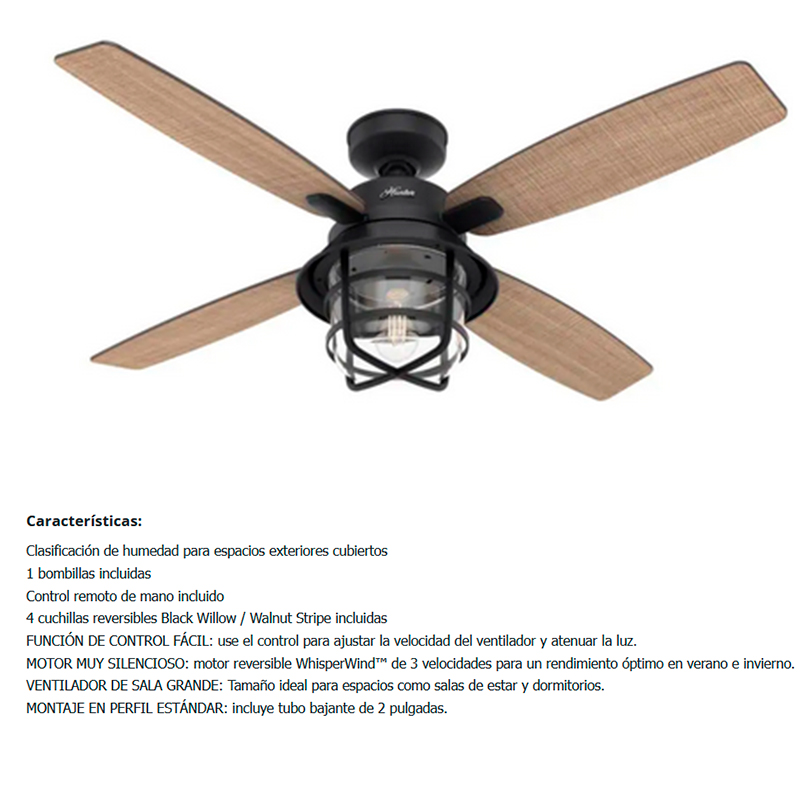 VENTILADOR TECHO PORT ROYALE 52" SAUCE NEGRO OUTDOOR DAMP 4ASPAS CON LUZ LED, PARA INTERIOR, MOTOR Y
