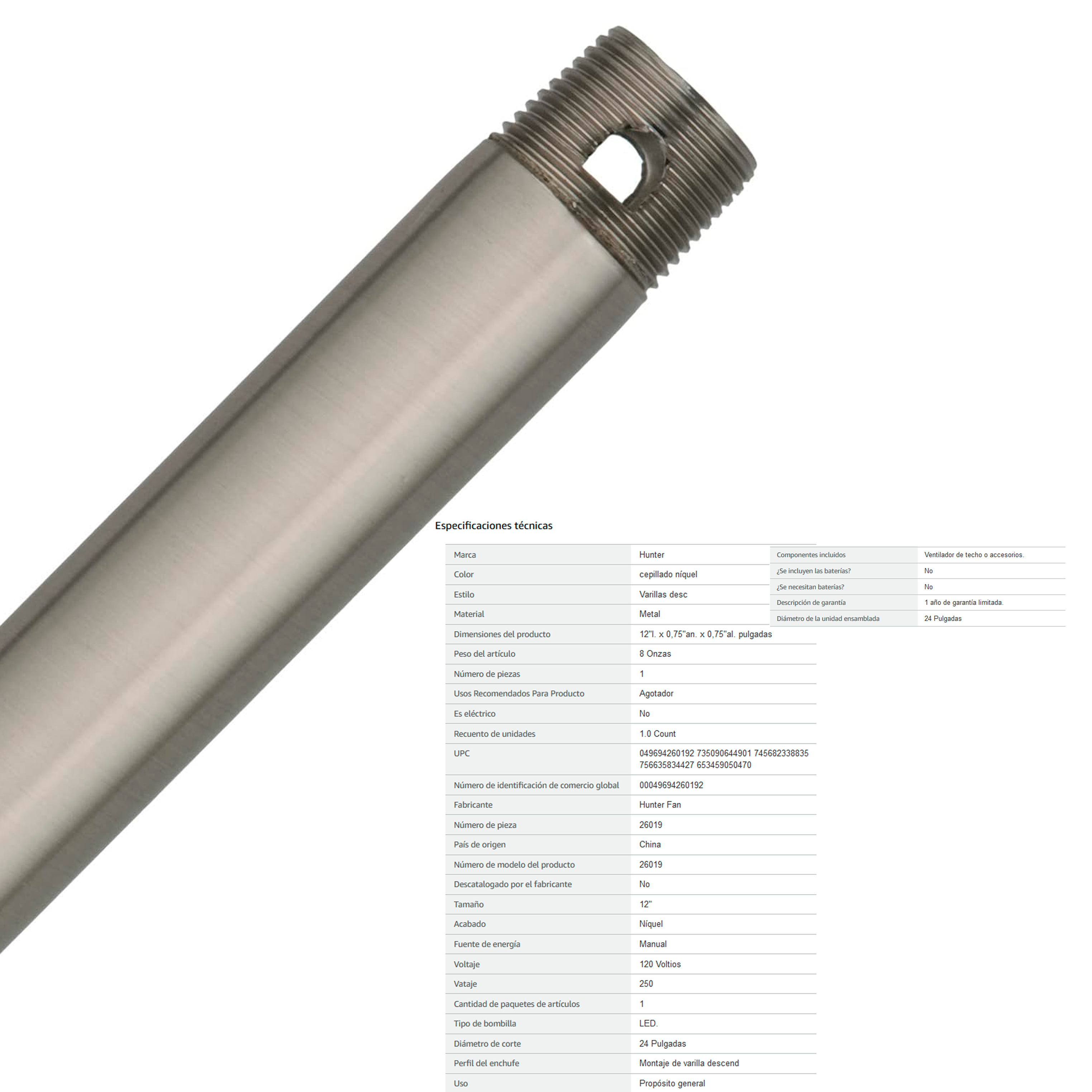 BARRA 3/4"X12" DE EXTENSION, NIQUEL CEPILLADO, INTERIOR, PARA VENTILADOR TECHO HUNTER
