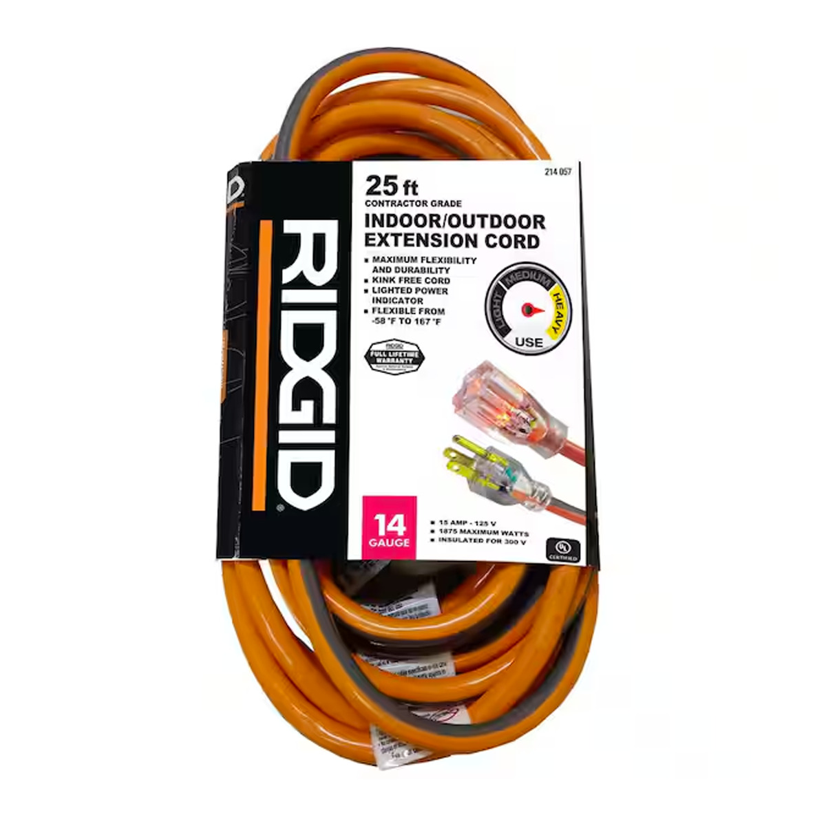 EXTENSION ELECTRICA RIDGID HEAVY DUTY 25 15AMP CALIBRE 14, 1875W, 125V C/ENCHUFE ILUMINADO P/INTER-E