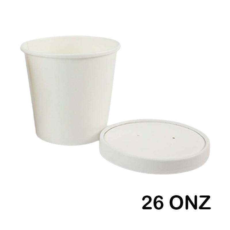RECIPIENTE REDONDO 26ONZ 4.5"X4.5" DE CARTON BLANCO P/SOPA C/TAPA BLANCA