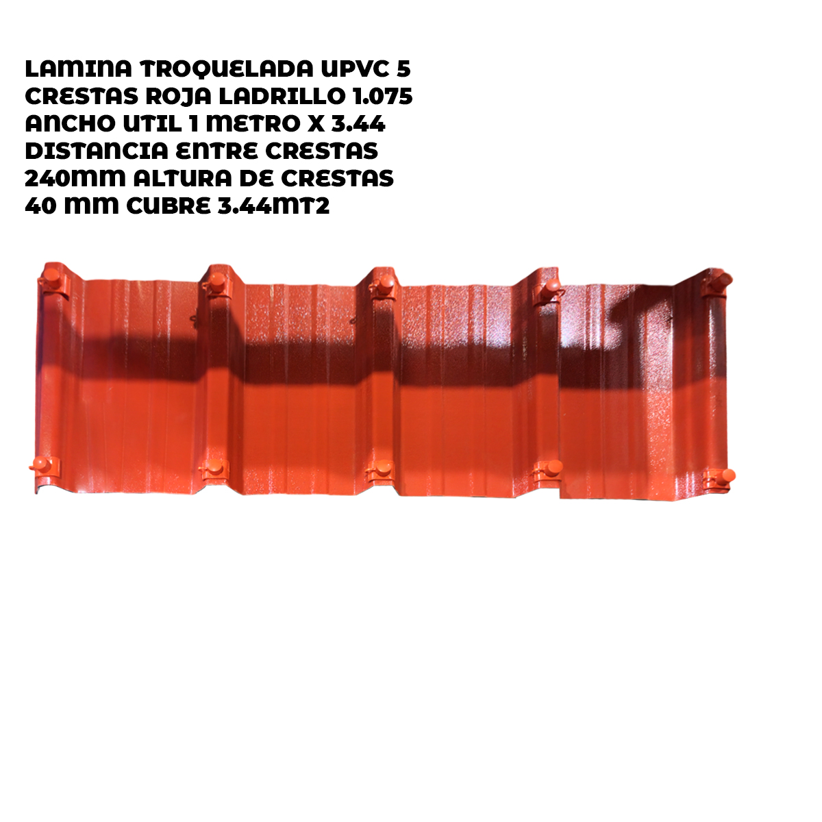 LAMINA TROQUELADA UPVC 5 CRESTAS ROJA LADRILLO 1.075 ANCHO UTIL 1 METRO X 3.44 DISTANCIA ENTRE CREST