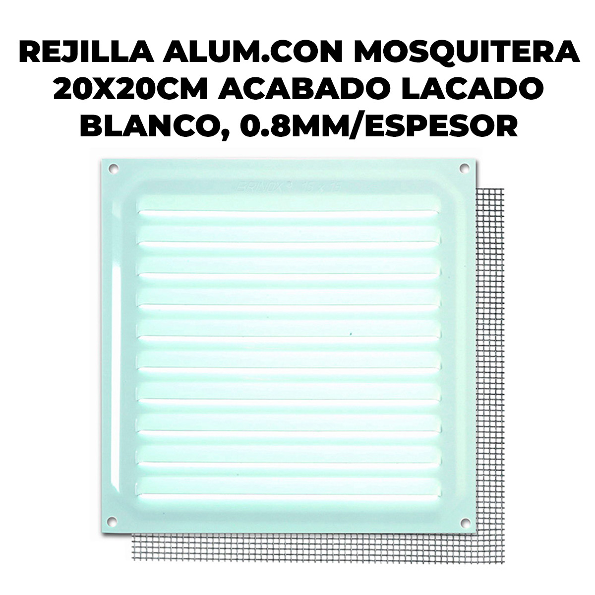 REJILLA ALUMINIO CON MOSQUITERA 7 7/8X7 7/8" (20X20CM) ACABADO LACADO BLANCO, 0.8MM/ESPESOR