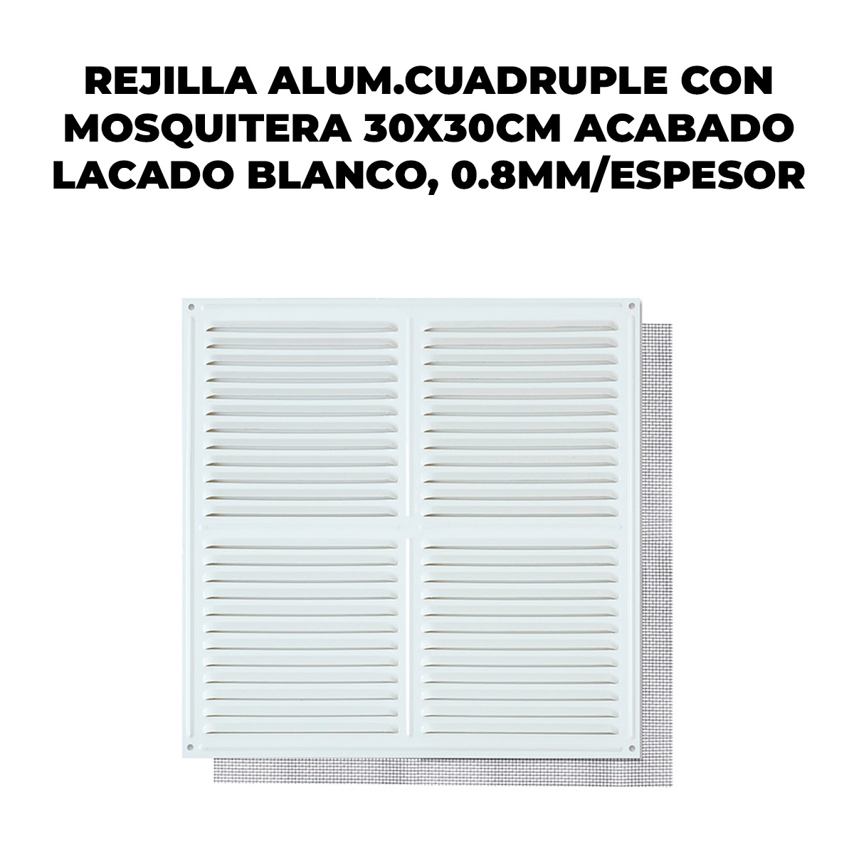 REJILLA ALUMINIO CUADRUPLE CON MOSQUITERA 11 7/8X11 7/8" (30X30CM) ACABADO LACADO BLANCO, 0.8MM/ESPE