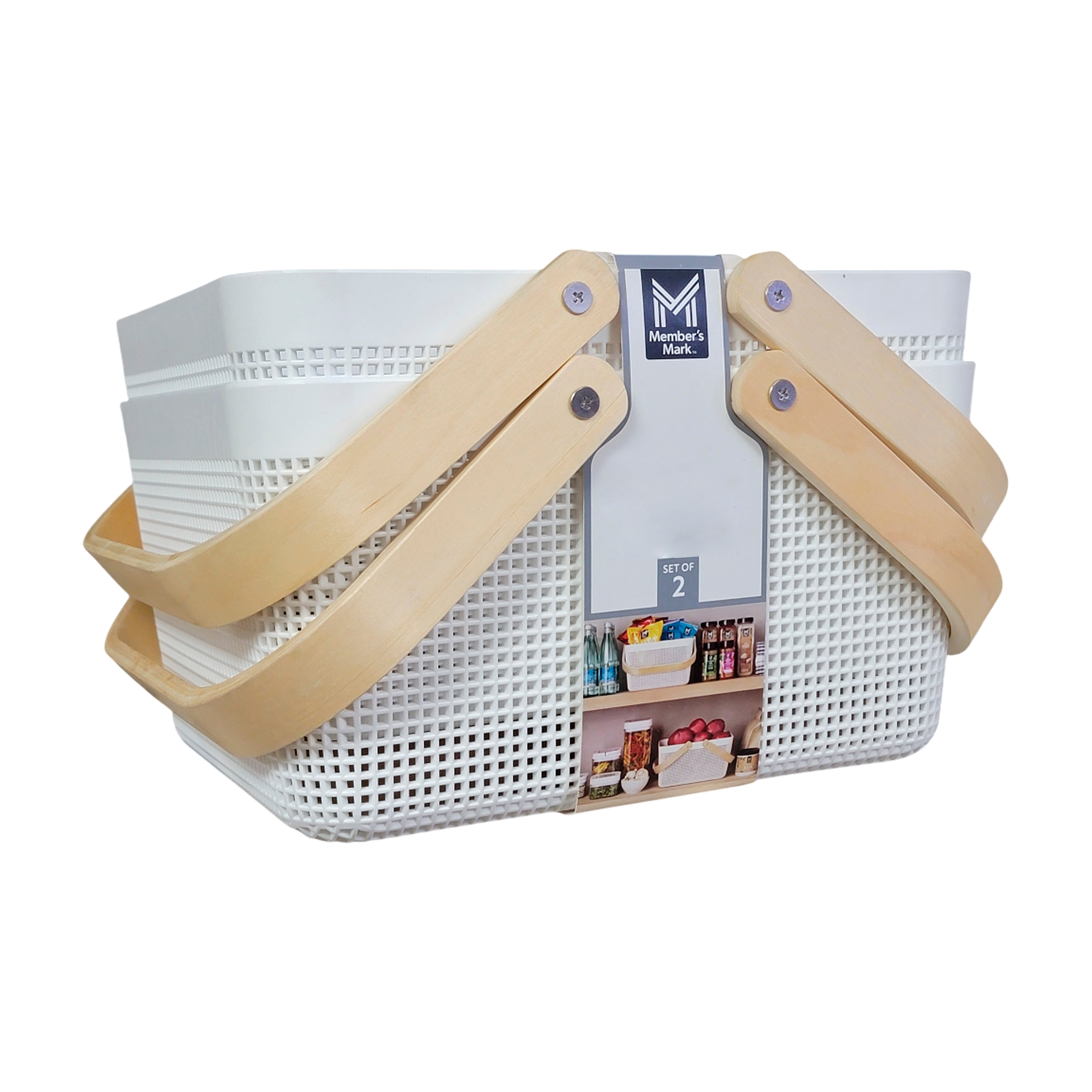 JUEGO DE 2 CESTAS PLASTICAS PERFORADAS BLANCAS 12.5"X10.3"X6.1"CON ASA DE MADERA MEMBERS MARK