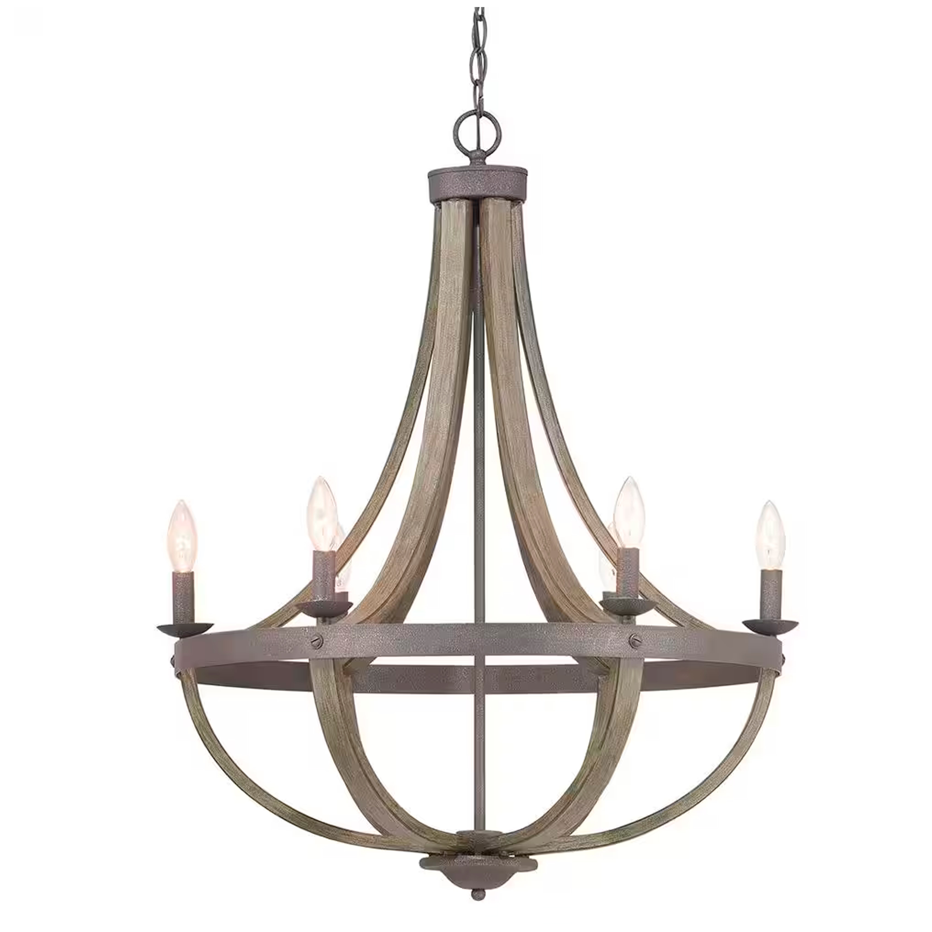 LAMPARA COLGANTE E/ARAÑA DE HIERRO ARTESANAL C/6LUCES DETALLES RUSTICOS DE MADERA DEL OLMO 26PULG.