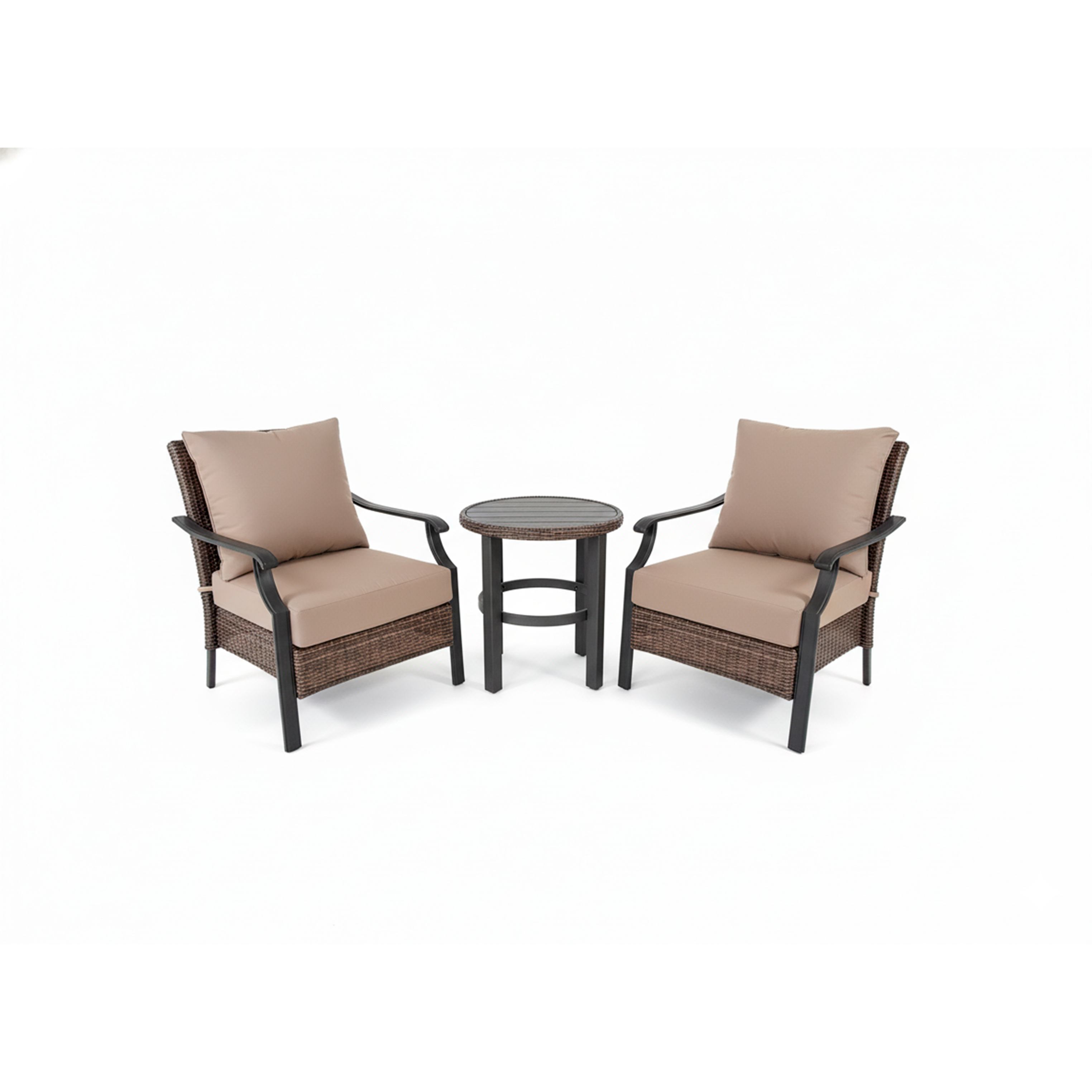 JGO. 2 SILLAS D/MIMBRE + 1 MESA REDONDA PEQUEÑA D/METAL, CON COJINES-COBERTOR, HAMPTON BAY.