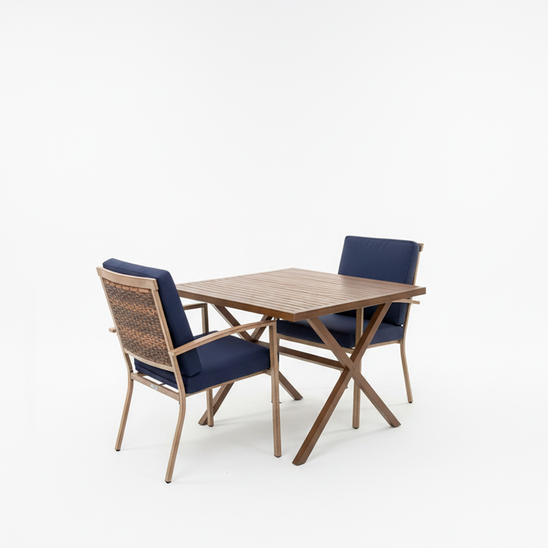 JGO. 2 SILLAS DE COMEDOR FIJAS D/METAL + 1 MESA D/METAL CAFE CON COJINES-COBERTOR AZUL, HAMPTON BAY.