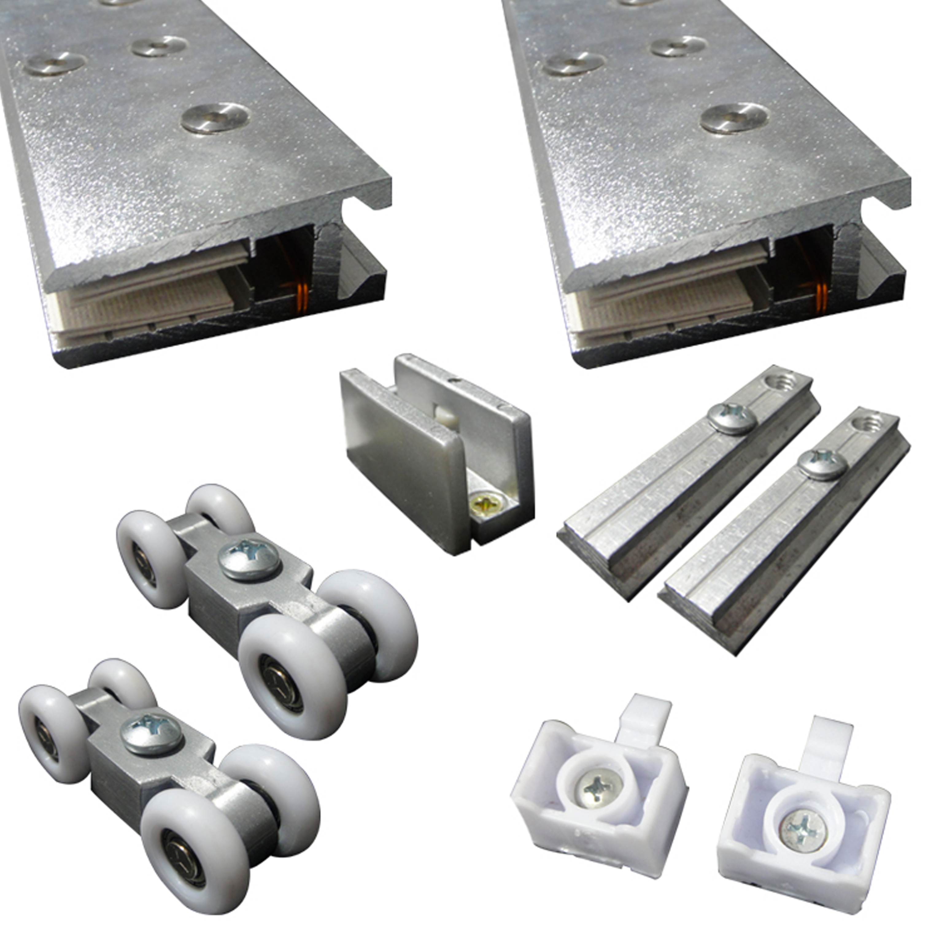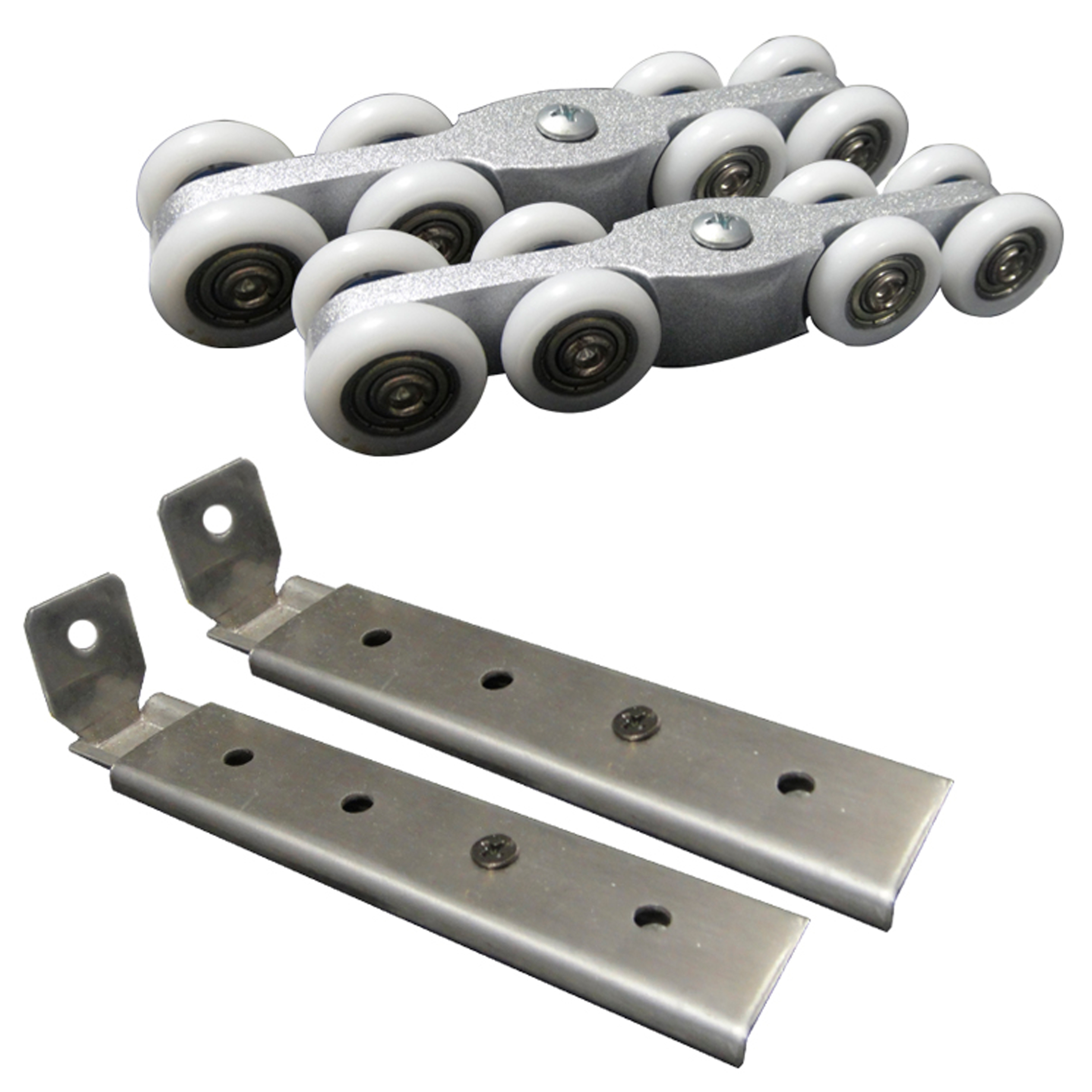 JGO DE 8 RODOS NYLON P/RIEL PJ-C013 C/PLACA Y TORNILLO DE ACERO INOX.CEPILLADO 304 P/VIDRIO DE 8-12M