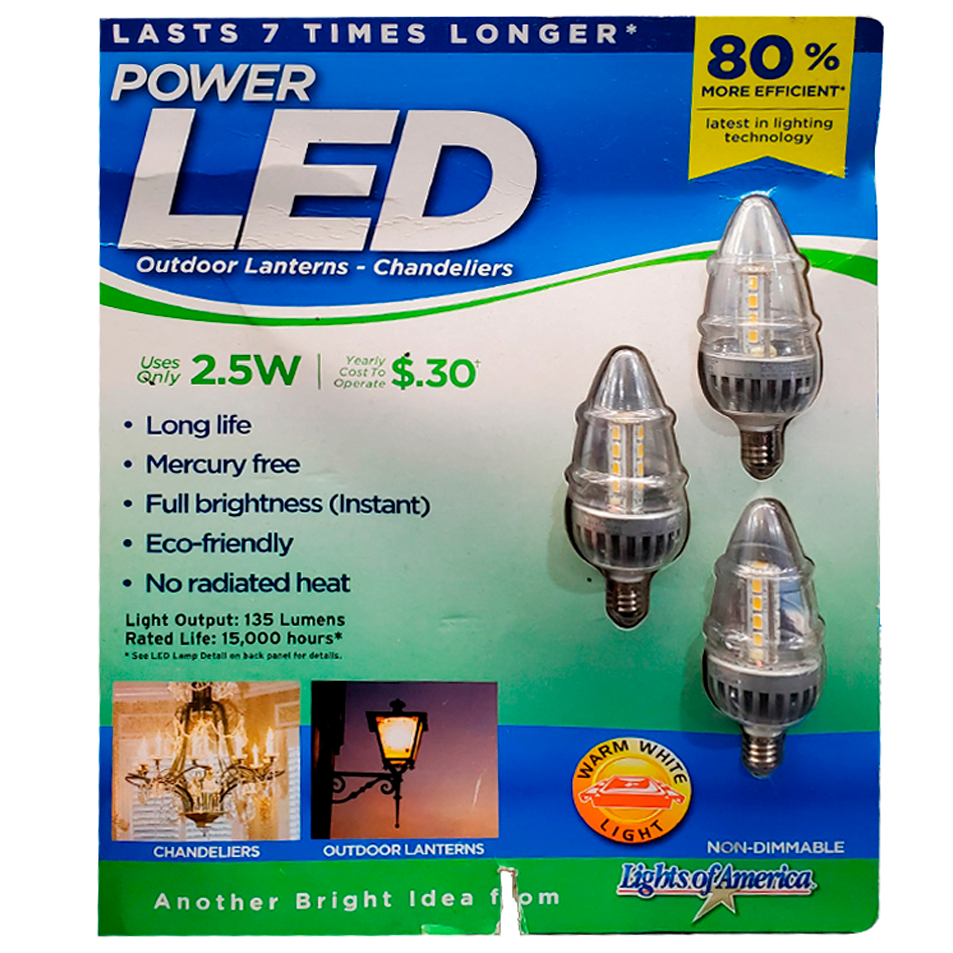 PAQ. 3 DE 2.5 WATTS BOMBILLOS LED PARA CANDELABRO / LAMAPARA AL AIRE LIBRE
