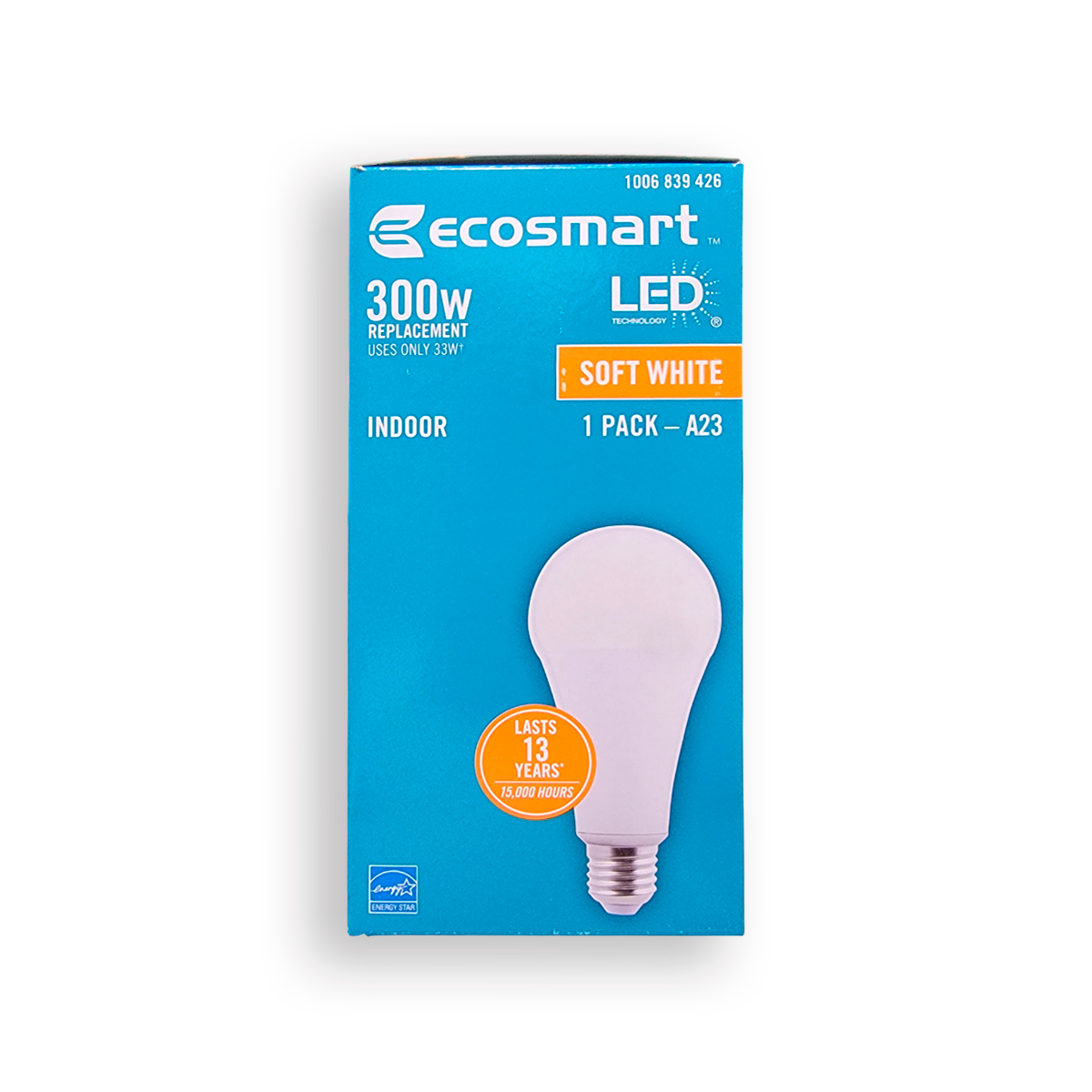 BOMBILLO LED 33W=300W DIMEABLE, SOFT WHITE, 300LUMS, 2700K, E26, ECOSMART.