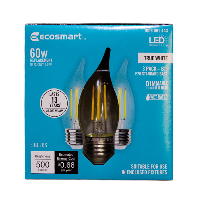 PAQ. 3 BOMBILLOS LED TIPO FLAMA 5.5W=60W C/FILAMENTO, DIMEABLE,DAYLIGHT,500LUMS,5000K, E26, ECOSMART