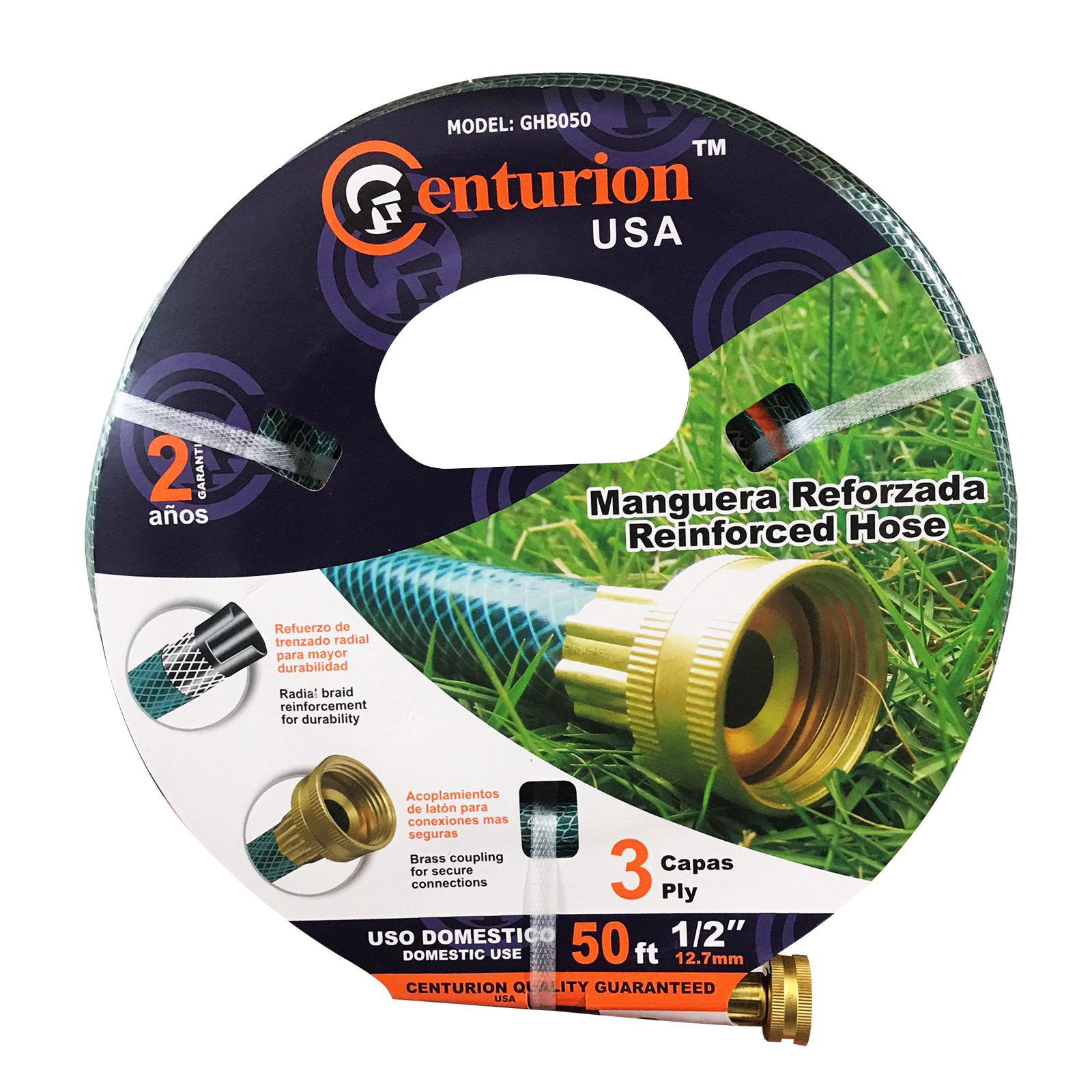 MANGUERA REFORZADA 3 CAPAS CON CONECCIONES DE BRONCE 1/2"X50´ MARCA CENTURION