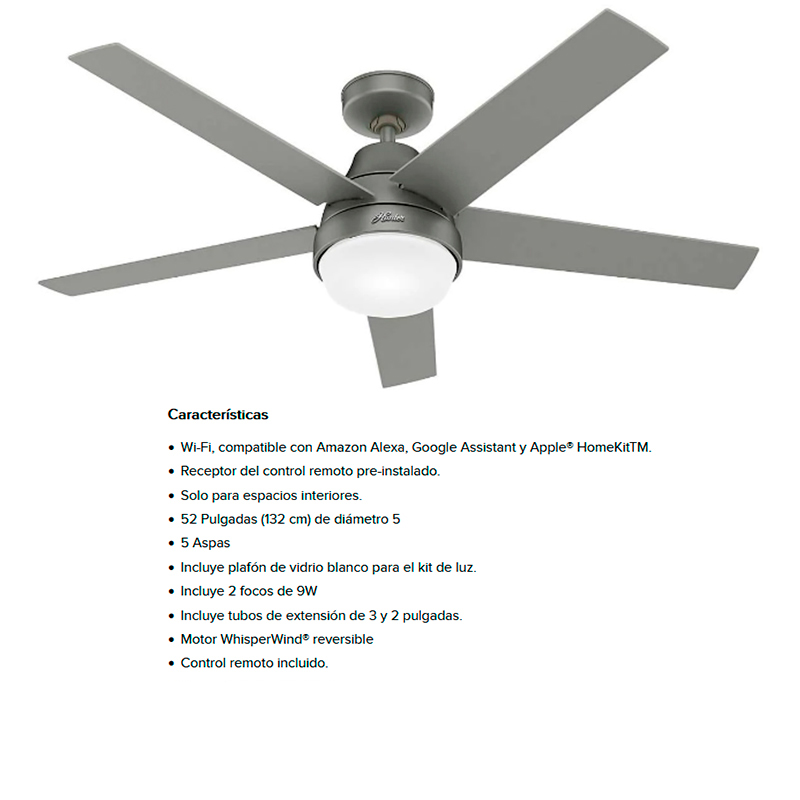 VENTILADOR DE TECHO REGALIAII DE 60"" CON LAMPARA 5 ASPAS ACABADO MATTE INT/EXT