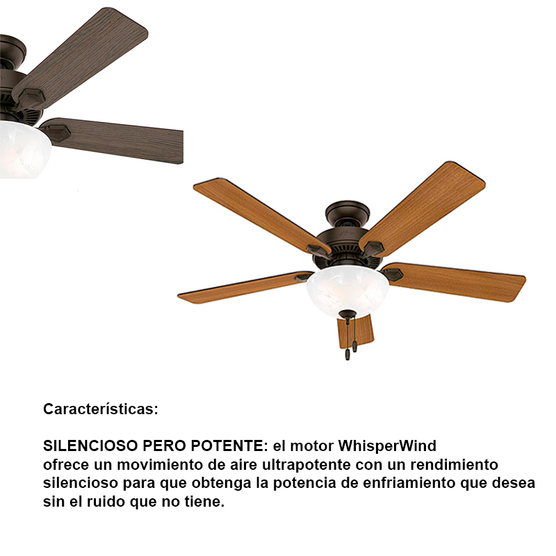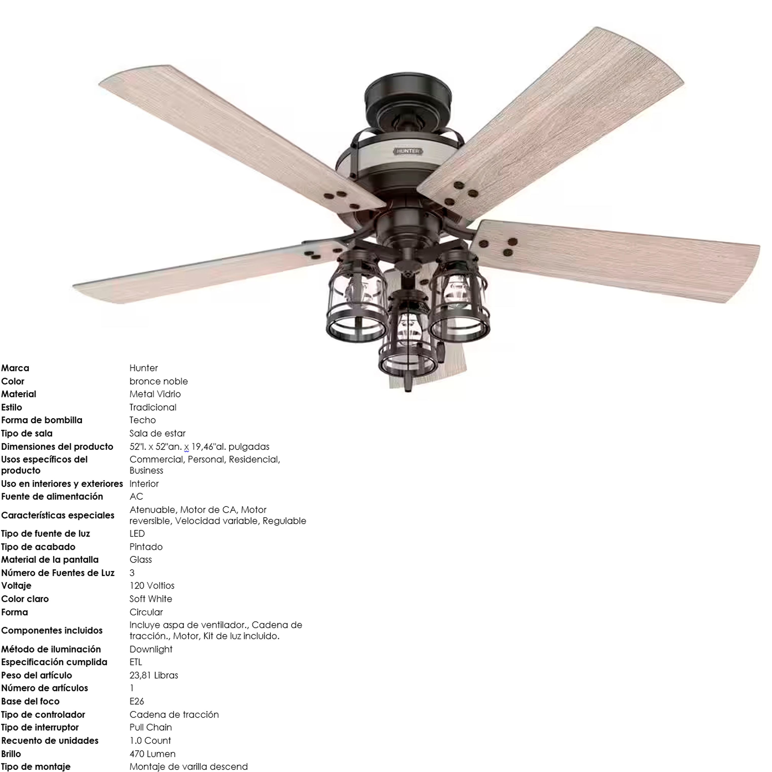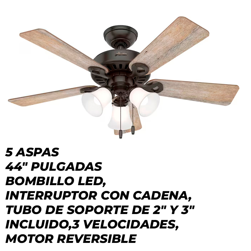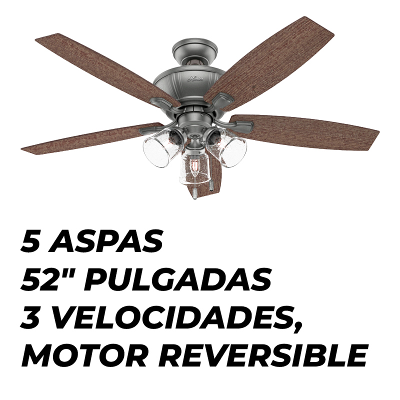 VENTILADOR DE TECHO DARLINGTON DE 52" CON 3 LAMPARAS 5 ASPAS ACABADO MATE P/INTERIOR