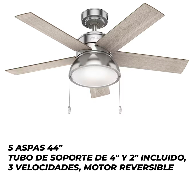 VENTILADOR DE TECHO 52" BARTLETT NIQUEL CEPILLADO 5 ASPAS CON LUZ, MOTOR REVERSIBLE