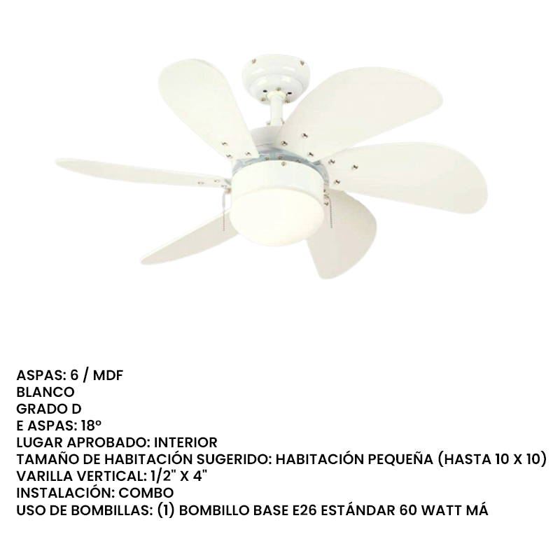 VENTILADOR DE TECHO 30" BLANCO TURBO SWIRL 6 ASPAS 3 VELOCIDADES