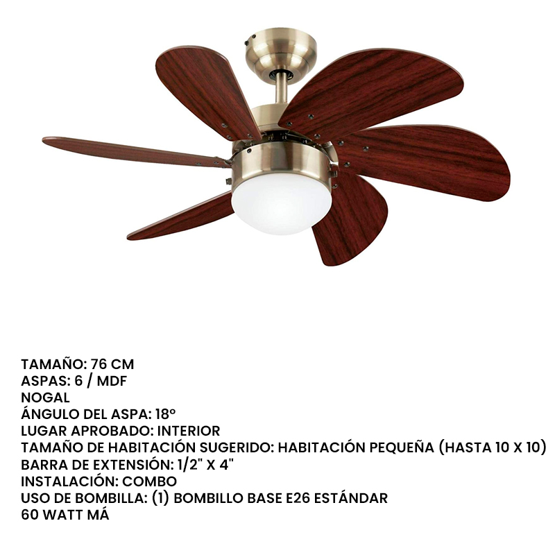 VENTILADOR DE TECHO 30" NOGAL TURBO SWIRL 6 ASPAS 3 VELOCIDADES