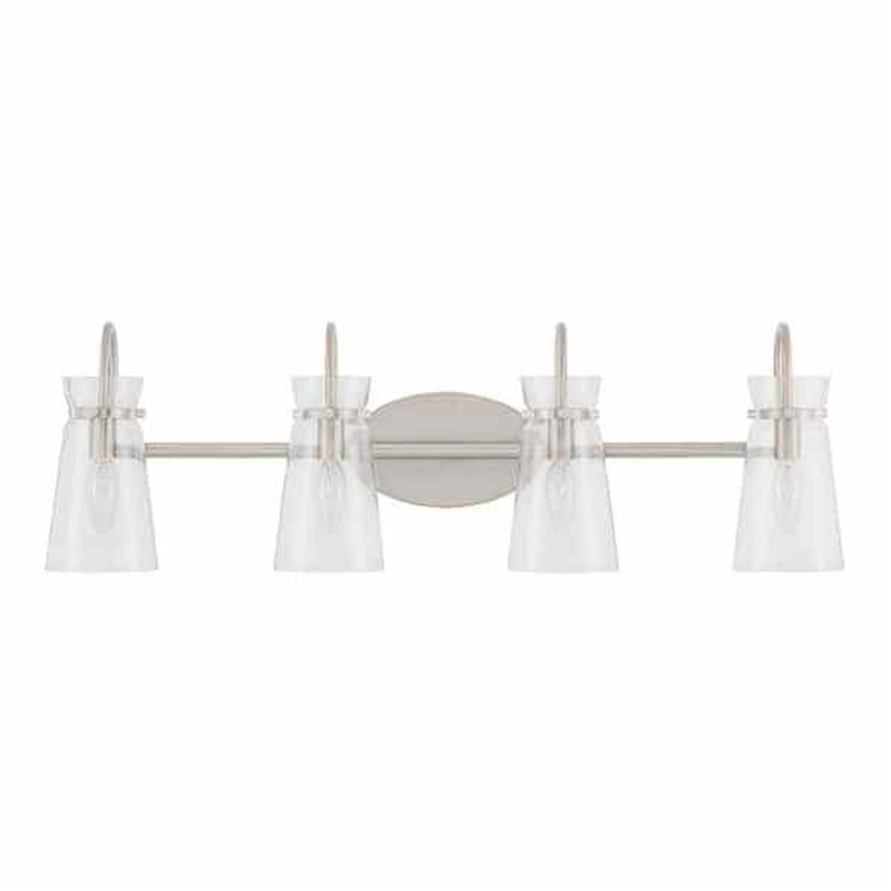 LAMPARA D/TOCADOR DE BAÑO DE NIQUEL B/4LUCES DE 31PULG. C/PANTALLA DE VIDRIO TRANSPARENTE VINTON