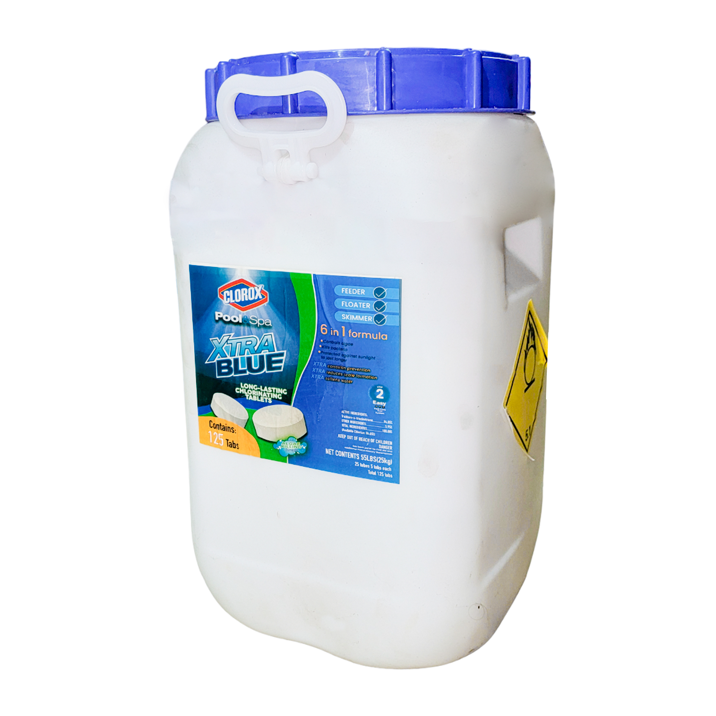 CUBETA 55LBS CLORO EN PASTILLA CLOROX XTRABLUE 6 EN 1 (25 TUBOS CON 5 PASTILLAS=125 PASTILLAS)